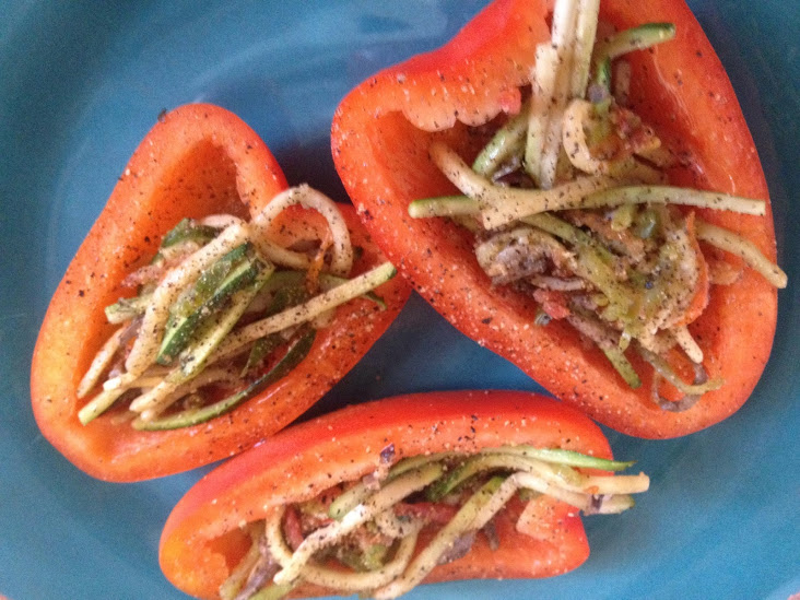 I like making things up. Here’s one we called Bell Pepper Boats. Take the shredder and shred a bunch of veggies. Lightly, and quickly, saute in water with a bunch of pepper, some peanut oil, soy sauce, and garlic. Take the mix out and dab dry on paper towel. Then lay the yumminess in the boat and start crunching away. My kids loved these, too!